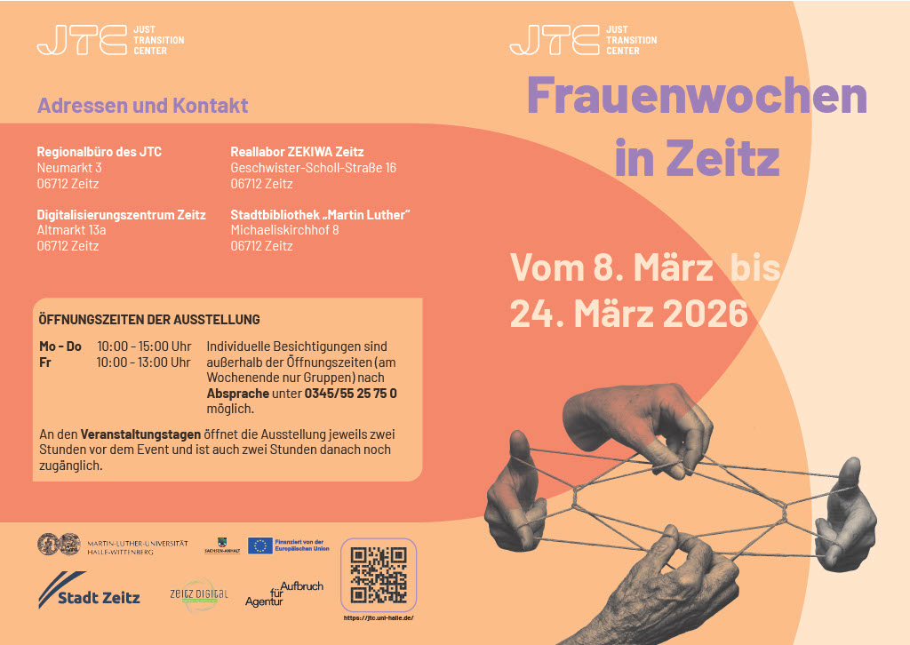 Eröffnet am 8. März, dem Internationalen Frauentag, setzt das Projekt Impulse für die anschließenden Themenwochen und verbindet regionale Praxis mit wissenschaftlicher Perspektive – eine Kernaufgabe des Just Transition Center.