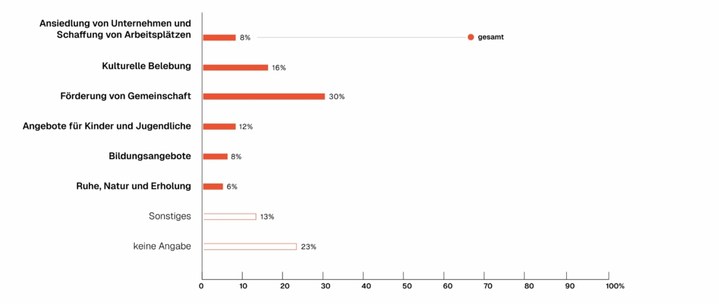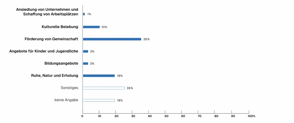 16 % stimmten mit Ideen wie „Ausstellungen“ für eine kulturelle Belebung, weitere 12 % sprachen sich für Angebote für Kinder und Jugendliche aus, wie z. B. „Disko“ oder „Spiele-Café“. Bildungs- und wirtschaftsbezogene Nutzungen wurden jeweils nur von 8 % genannt. Den größten Anteil mit 30 % formulierte den Wunsch nach Angeboten für mehr „Gemeinschaft“, z.B. mit Äußerungen wie „Treffpunkt für alle Generationen“, „Schaffung von Orten für Begegnung“ oder „etwas zum Zusammenkommen“. Den wenigsten Zuspruch mit nur 6% erhielt „Ruhe, Natur und Erholung“.