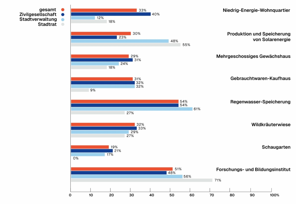 Unterschiedlich bewerten die Akteursgruppen energetische Themen: Ein Drittel der Zivilgesellschaft spricht sich bevorzugt für ein Niedrigenergie-Wohnquartier aus, während Verwaltung (48 Prozent) und Stadtrat (55 Prozent) Energieerzeugung und -speicherung favorisieren. Die Einsparung von Energiekosten scheint ein vorrangiges Ziel der Stadt Zeitz zu sein.