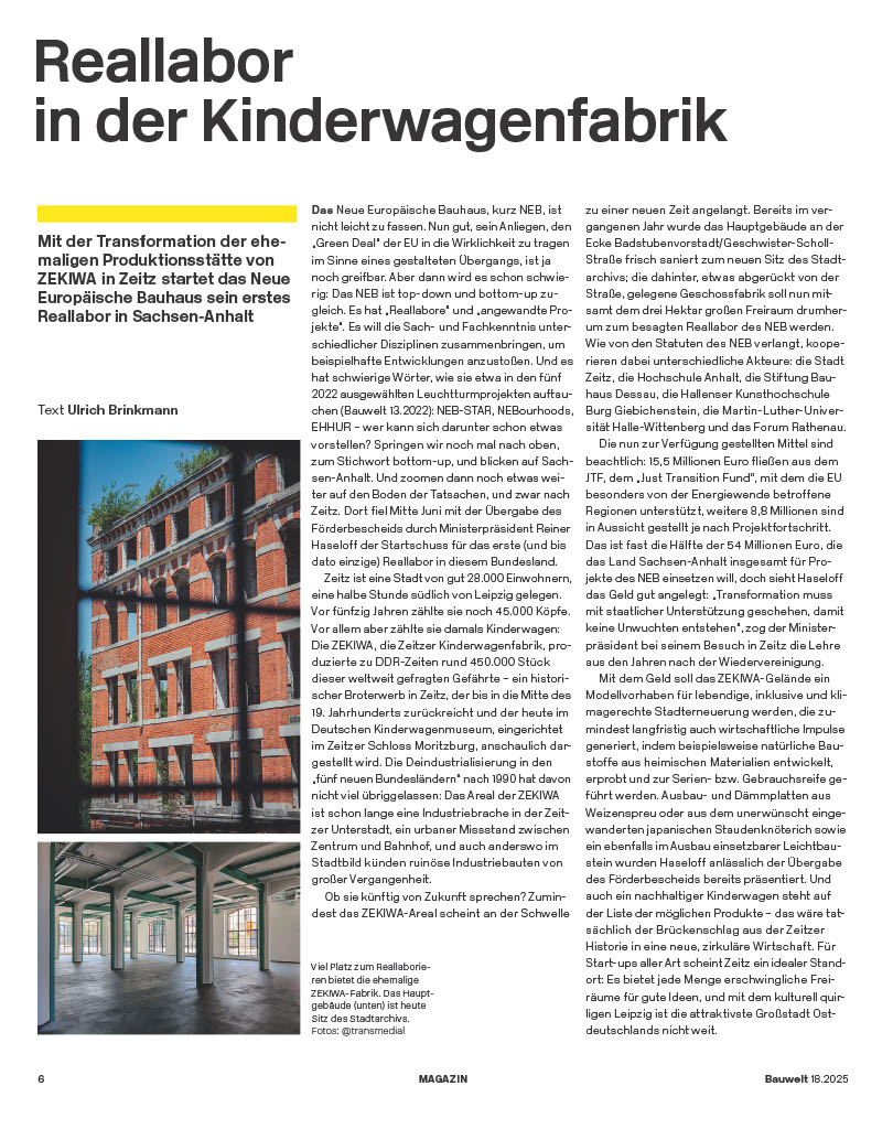 Dem Onlineauftritt der renommierten Zeitschrift „Bauwelt“ folgen jeden Monat um die 140.000 Interessierte. Im September hat sie nun in der Ausgabe 18/2025 einen Beitrag ihres Redakteurs Ulrich Brinkmann veröffentlicht, der sich mit dem REALLABOR ZEKIWA ZEITZ auseinandersetzt. Brinkmann war eigens an dem Tag nach Zeitz gereist, als Ministerpräsident Reiner Haseloff die Bewilligungsbescheide übergeben hatte. Immerhin 15,5 Millionen Euro fließen aus dem JTF, dem „Just Transition Fund“ und in Aussicht gestellte weitere 8,8 Millionen, die sich am Projektfortschritt orientieren.